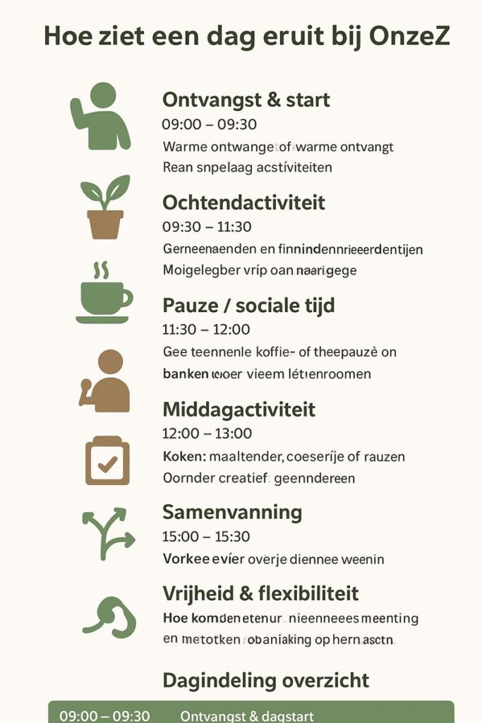 Bij Dagbesteding OnzeZ draait een dag om welbevinden, structuur en persoonlijke groei. Elke dag is gevarieerd, maar voorspelbaar, zodat deelnemers rust en overzicht ervaren. Hieronder zie je hoe een typische dag eruit kan zien.